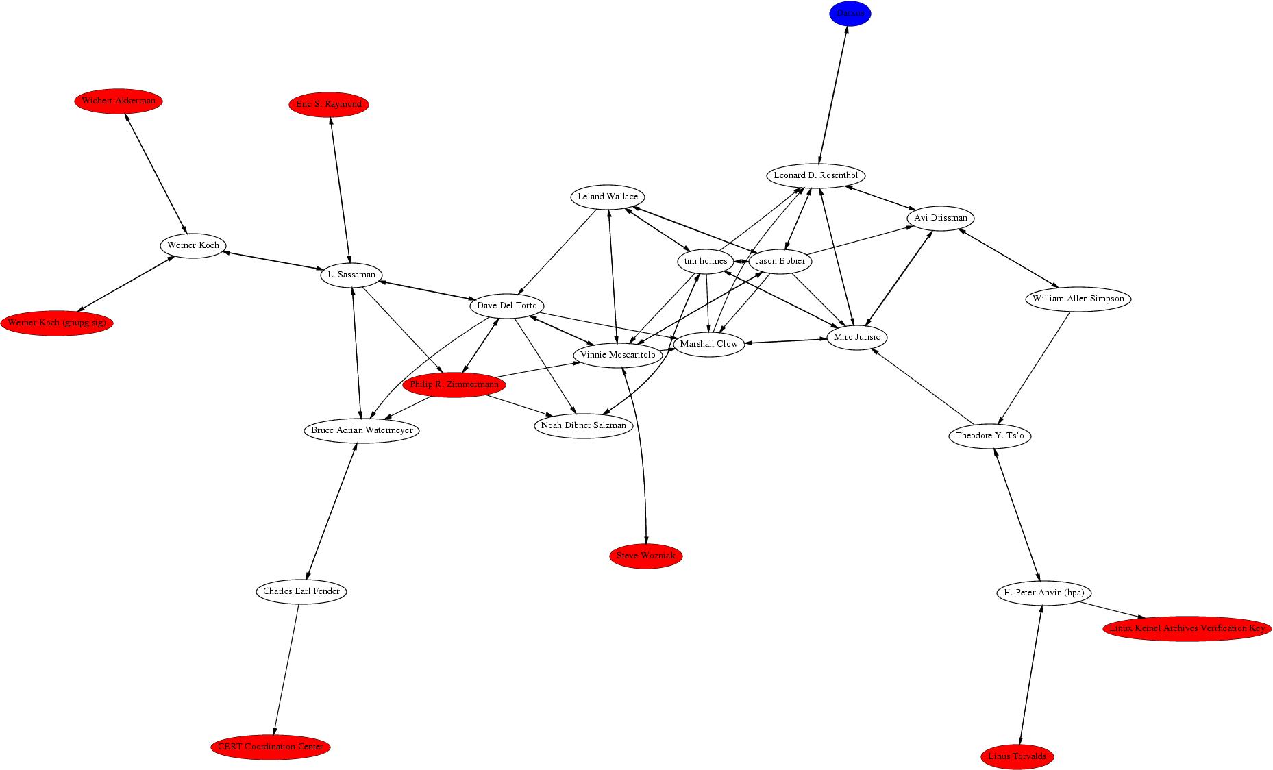pub 1024D/57548DCD 1998-07-07 Werner Koch (gnupg sig) <dd9jn@gnu.org> pub 1024D/148C6F43 1997-10-16 Steve Wozniak <steve@woz.org> pub 1024D/449FA3AB 1999-10-05 Linus Torvalds <torvalds@transmeta.com> pub 1024D/2FA3BC2D 1998-07-05 Wichert Akkerman <wakkerma@debian.org> pub 1024D/517D0F0E 2000-10-10 Linux Kernel Archives Verification Key <ftpadmin@kernel.org> pub 1024D/8421F11C 1997-10-05 Eric S. Raymond <esr@thyrsus.com> pub 1024D/FAEBD5FC 1997-04-07 Philip R. Zimmermann <prz@pgp.com> pub 1024R/20B19259 2000-09-20 CERT Coordination Center <cert@cert.org>If you know of other keys worth tracing from/to, please email me.