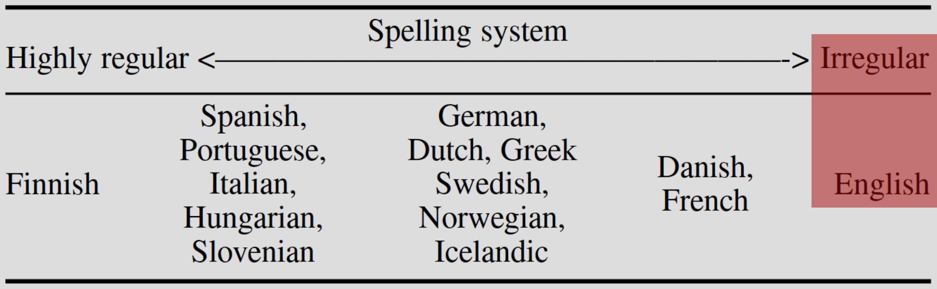 A popular example of spelling inconsistency that is at least 140 years old: If the 'gh' sound in 'enough' is pronounced 'f', and the 'o' in 'women' makes the short 'i' sound and the 'ti' in 'nation' is pronounced 'sh' then the word 'ghoti' is pronounced just like 'fish'. Those problems can be fixed with these changes: